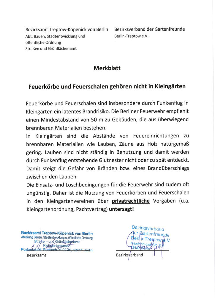 Merkblatt „Feuerschalen und Feuerkörbe gehören nicht in Kleingärten“