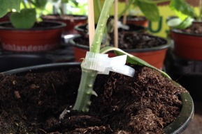 In gleicher Weise wird mit der Gurke verfahren, nur entgegengesetzt. Danach werden die beiden Schnitte ineinandergeschoben und verbunden. Jetzt kann sich die veredelte Gurke weiterentwickeln. Auch Tomaten werden immer häufiger veredelt. Gängige Unterlagensorten sind z.B. ‘Estamino’ und ‘Vigomax’ F1.