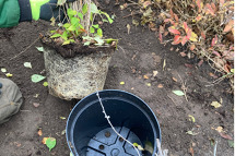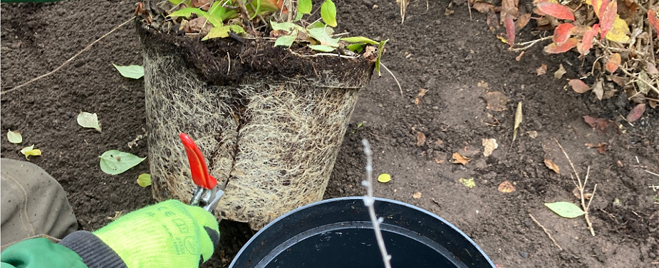 Container: Entfernung des Containers und anschließend den Wurzelballen Aufreißen oder Anschneiden (Blumentopf-Effekt)(siehe Bild oben).