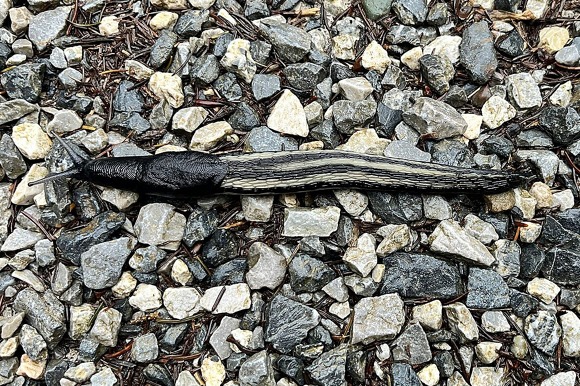 Der Schwarze Schnegel (Limax cinereoniger). Zwar eine Nacktschnecke, aber ohne schädliches Verhalten. Leicht mit der Schwarzen Wegschnecke (Artion ater) zu verwechseln.