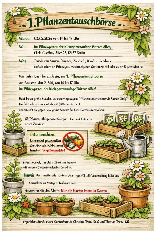 Am 02.05.2026, 14-17Uhr, Pflanzentauschbörse im Pflück- und Bürgergarten der KGA Britzer Allee