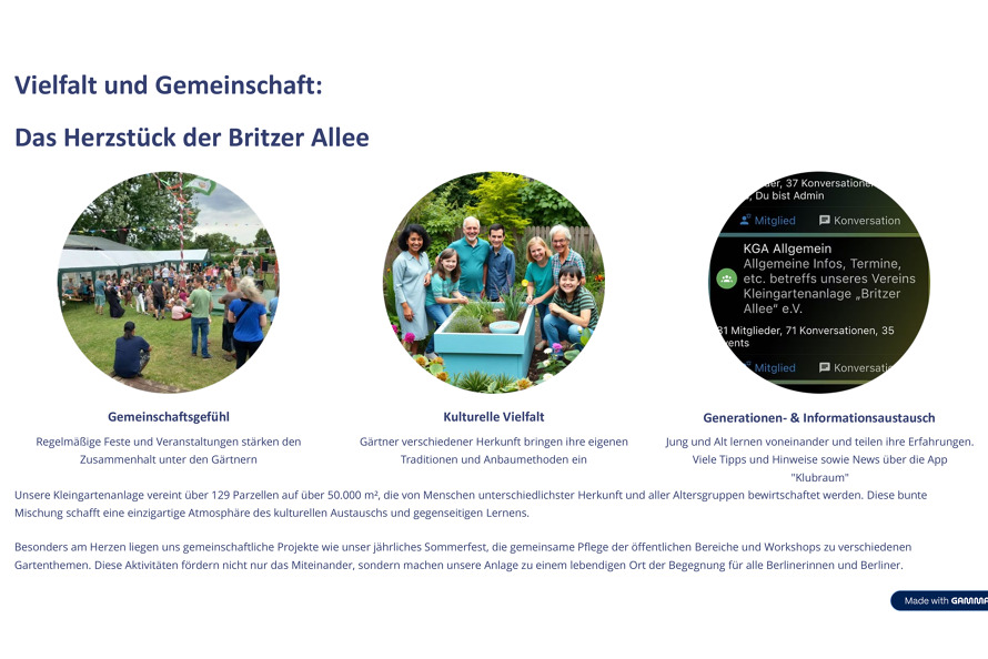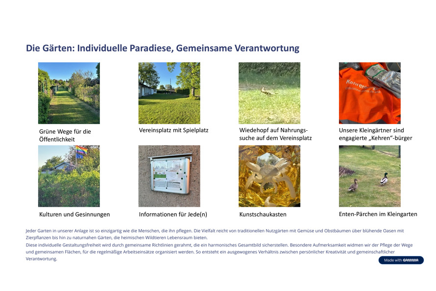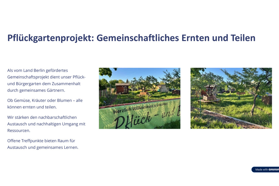 Wir stellen unsere Projekte vor, darunter den Pflück‑ und Bürgergarten, Maßnahmen zur Förderung der Artenvielfalt und Bildungsangebote für Kinder und Nachbarschaft. Ziel war es, Best Practices zu zeigen, die sowohl ökologisch wirksam als auch sozial verbindend sind. Die Teilnahme diente außerdem dazu, Fördermöglichkeiten und Vernetzungen zu stärken und Impulse für weitere Projekte zu gewinnen.