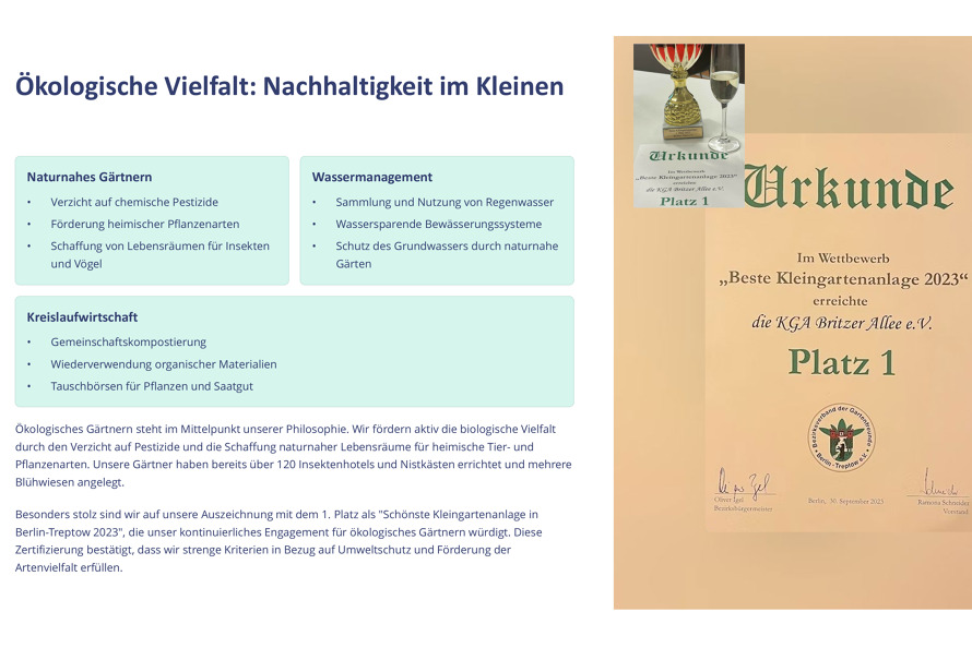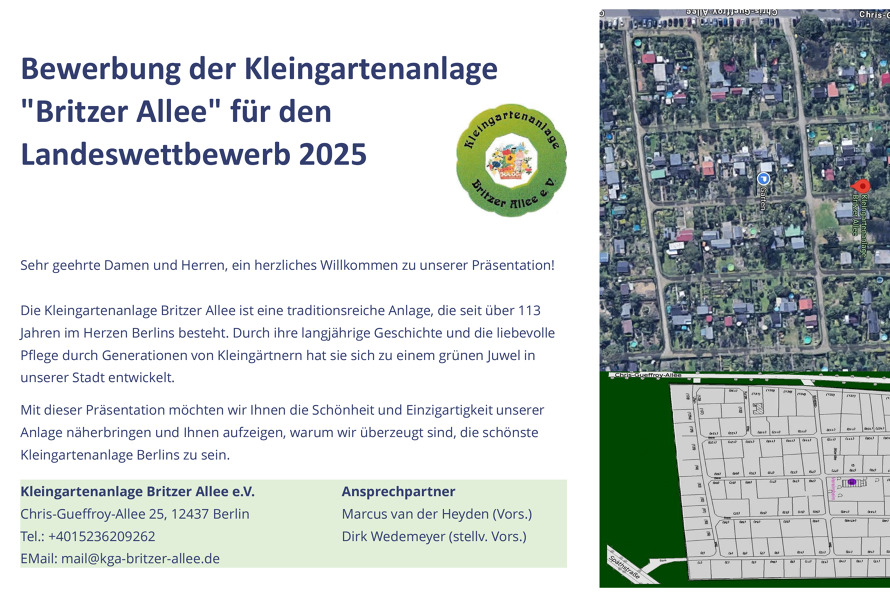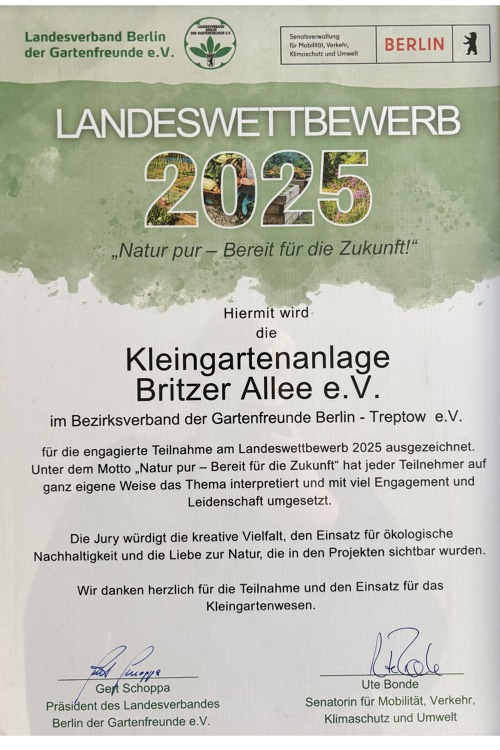 Der Landeswettbewerb des Landesverbands Berlin der Gartenfreunde richtete sich an Berliner Kleingartenvereine und stand 2025 unter dem Motto „Natur pur – Bereit für die Zukunft!“. Ziel war es, nachhaltige, naturnahe und zukunftsfähige Konzepte in Kleingartenanlagen zu würdigen und öffentlich sichtbar zu machen.